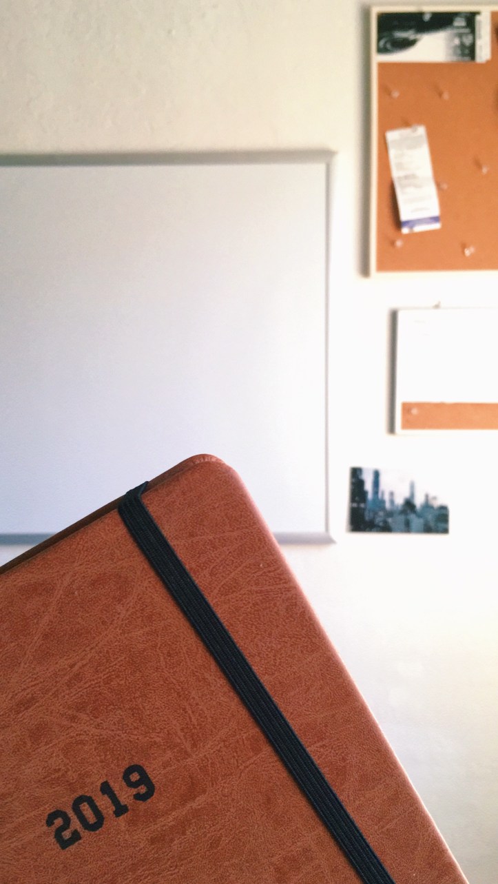 The planner itself has monthly calendars, daily cells for planning your day to day tasks, a year overview for denoting how your day went. There’s also a notes section, bookmark, binding strap and a folder at the end. It’s also leather looking which fits right in with my aesthetic. Behind my planner pictured above you can see my weekly whiteboard, regular big whiteboard, my cork board and some photos I’ve taken.