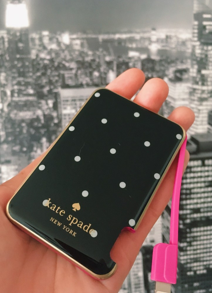 If you were to go into Nordstrom right now probably you’d find one of these cute Kate Spade chargers. However, it be priced at $15 instead of having to pay that much I got mine for 7.99 + tax at Marshall’s. It holds about 1800 mAh and there’s lights to tell you how full it is. It is very compact, hardy and cute!!