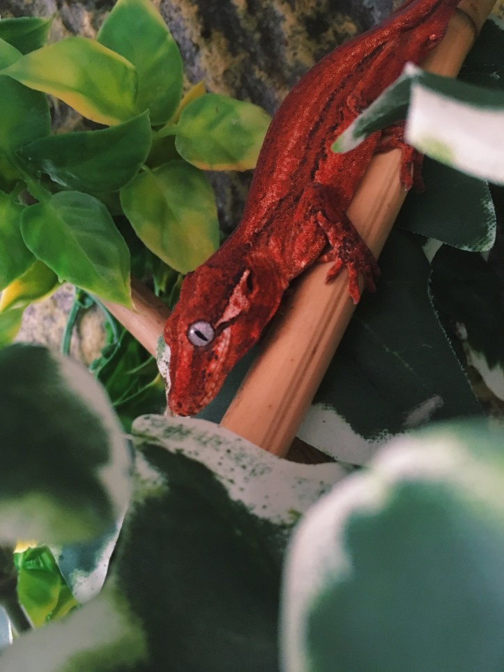 Pictured above is our nearly 7 month old Gargoyle Gecko from Geckogen!! His name is Aztec, he’s an Aberrant morph and thats about all I know about him as of now. He’s super elusive like the majority of the Rhacodactylus Auriculatus species. I’ve been trying to handle him at least once a day just so he knows me and wont freak if I touched him in his tank. He’s super sweet, very shy, and always ready to eat if you have a steady hand. He eats the same mix as our Crested Geckos, it’s currently Fig + Insects and Fruit Mix + BSFL. We have been trying to get Wax Worms to plump him up, but we always forget to snag one at Petsmart.