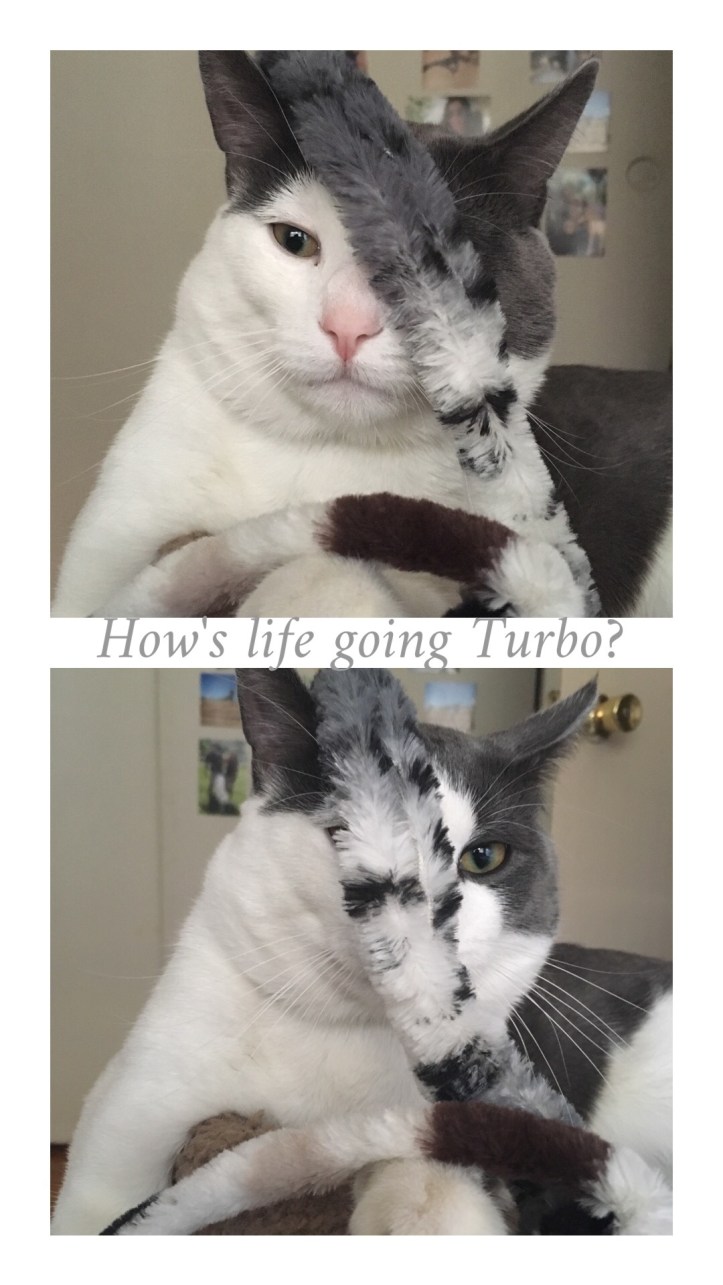 When we got Turbo from Reys family we wanted to give him the best diet possible, and the closest cuisine to what he’d eat naturally. We do feed him a lot of fish since most of his things toywise are fish related being that we work with Poke. In all good fun though, he gets various other meats like chicken, beef, various types of liver, turkey and even duck. His fish meals have chunks of fish giving him the opportunity to really gnaw on it like he caught it. Or at least I imagine it’s that’s satisfying for a cat. He’s gets half a scoop of his dry food (we cut him back due to his belly/neck/face rolls) with Life Bits for Indoor Cats. Overall we love his diet, how healthy he is, and how nice his coat is aside from when it goes yellow on his accord. Turbo also learns well with treats by Whole Hearted and some from our local rat feeder store with blueberry!!