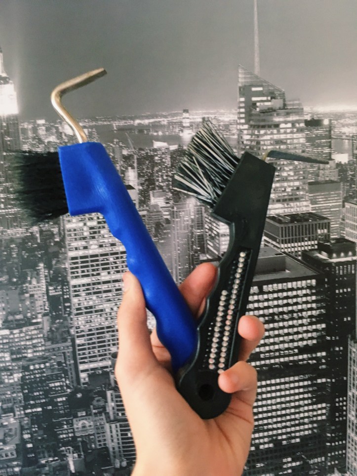 A good hoof pick is one of the best tools in your tool belt. I use them for getting ticks out sometimes, obviously for its normal use as a pick and in some cases cleaning my own footwear. I love the Lettia Collection bedazzled hoof picks, they have a great flat pick and it’s easy to sharpen if need be. The blue one, I actually traded for my black one of the same model to match my kit, the original black one came from a SHE package. Speaking of that package, it came with 2 Snaks Fifth Avenchew SHE Cookies and a cute SHE rag.