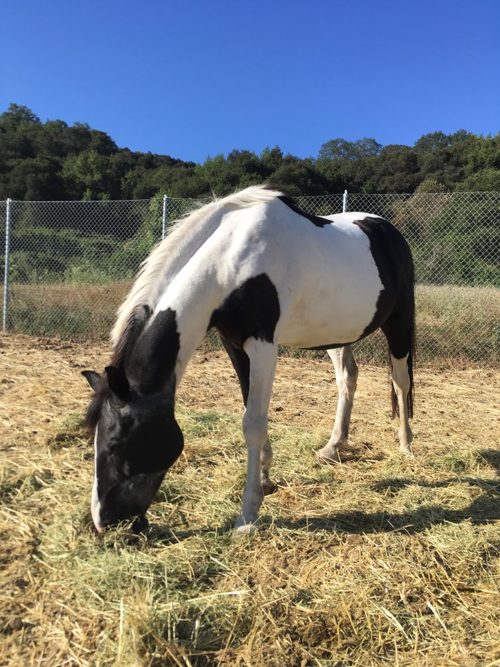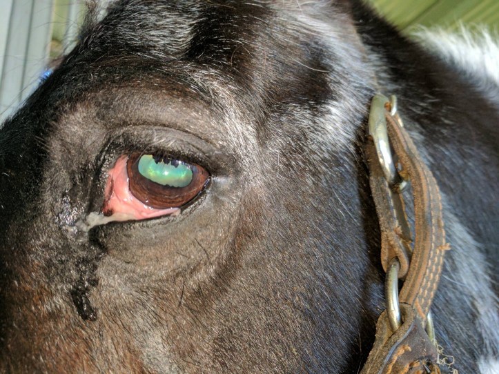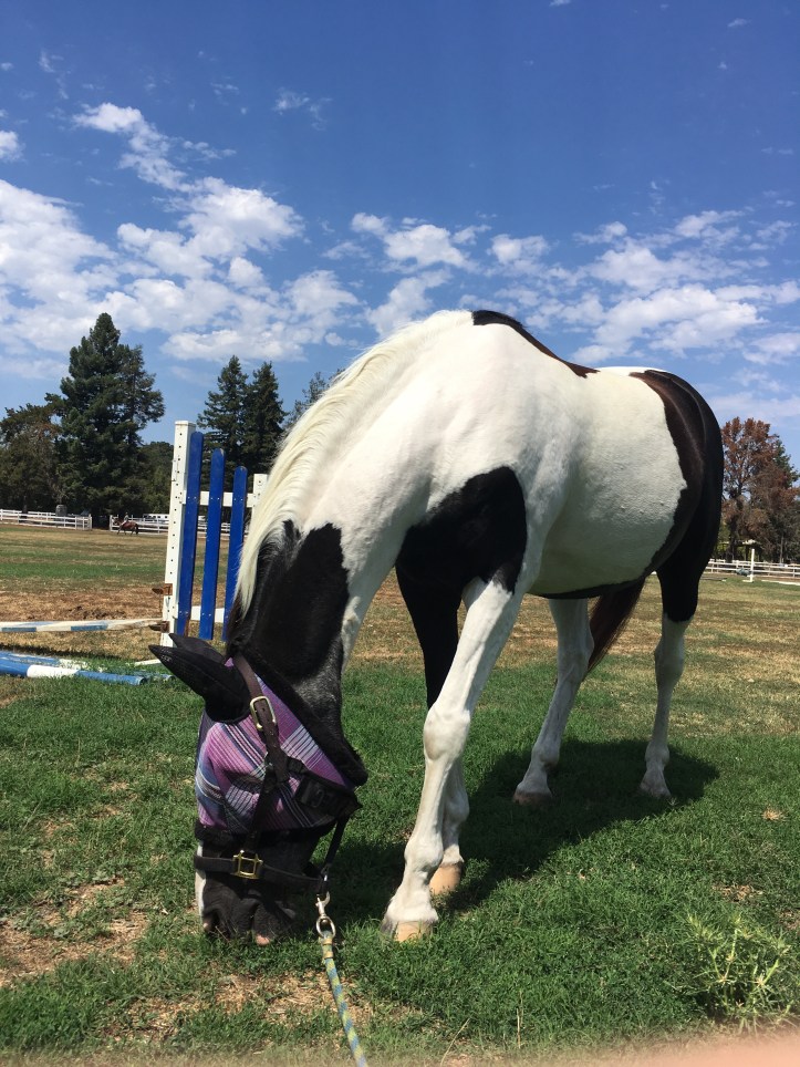 A year ago today I decided to TLC Caz. He’s an old 24 year old Black Tobiano gelding at Webb. He’s a former 3* Dressage mount and the sweetest goober when he lets you in. He has been through a lot in life, he was kicked in the eye before I started working at Webb; and his eye has a resulting pocket from fracturing the orbital. (Pictured Below) I got him that Lavender Mint plaid flymask to help with eye build up.
