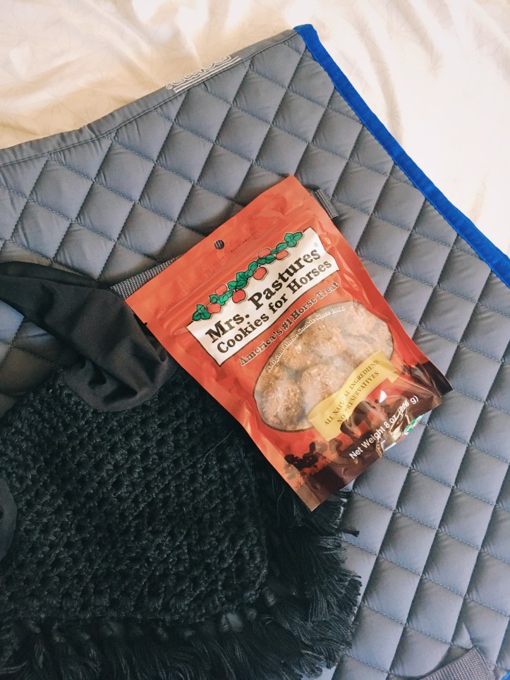 Okay so I’m sorry for pulling your leg to get you to read this, but I won a giveaway and had to share. Pictured above is my prize for entering into an Instagram giveaway hosted by @TempeTheSportHorse. She got a Grey/ Royal Blue Full size Roma dressage pad, which is going to look stunning on Capone. In addition to that there’s a black fly bonnet which I want to get a fun patch for so Capone can be all decked out in something I’m passionate about. Last, but not least she included a small bag of Mrs. Pastures cookies which I already know Capone loves, and honestly I won’t be mad if they sit in my car for a bit and make it smell like human cookies. That would just be how the cookie crumbles!! In terms of a minor Capone update, I got a large bottle of my Marigold Eqyss Spray to keep Capone dark and I dropped it off at the barn along with a duplicate cat tree for a fellow boarder and former coworker; but I haven’t been out since to do anything with the pony man himself. He is showing this upcoming Friday so we’ll see how he looks and does with my bestie girl Fallon.