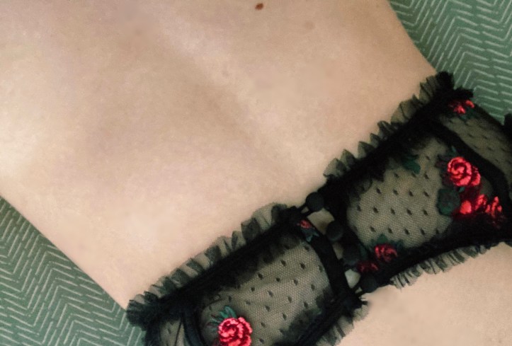Ugh, I’m so excited for this piece I can hardly contain myself!! Since I was a sophomore in high school I have been a huge fan of For Love & Lemons. My friends wore their various two pieces, dresses and lingerie at school and various school functions and I fell in love with their style and lace. When I found out they were doing a collaboration with Victoria’s Secret my heart and soul just about exploded, I could finally own a piece from them without paying an arm and a leg for it. On the actual For Love site the Rosebud Garter is completely sold out and there’s a wait list for the next restock. I was so happy to snag this piece before it was gone forever or until the potential restock. Originally priced at $49, I bought mine for $34.30. The sizes range from XXS-M and potentially run a little small, without knowing that I bought a small so I hope it fits okay. The garter is made of 95% polyester and 5% spandex, unlike the other pieces I bought, it is machine washable. It has three buttons for a front close, has tulle trim and feminine flowers covering the body. Best paired with the matching Rosebud thong (sold out in a medium sadly), Rosebud Bra or Rosebud Bustier.