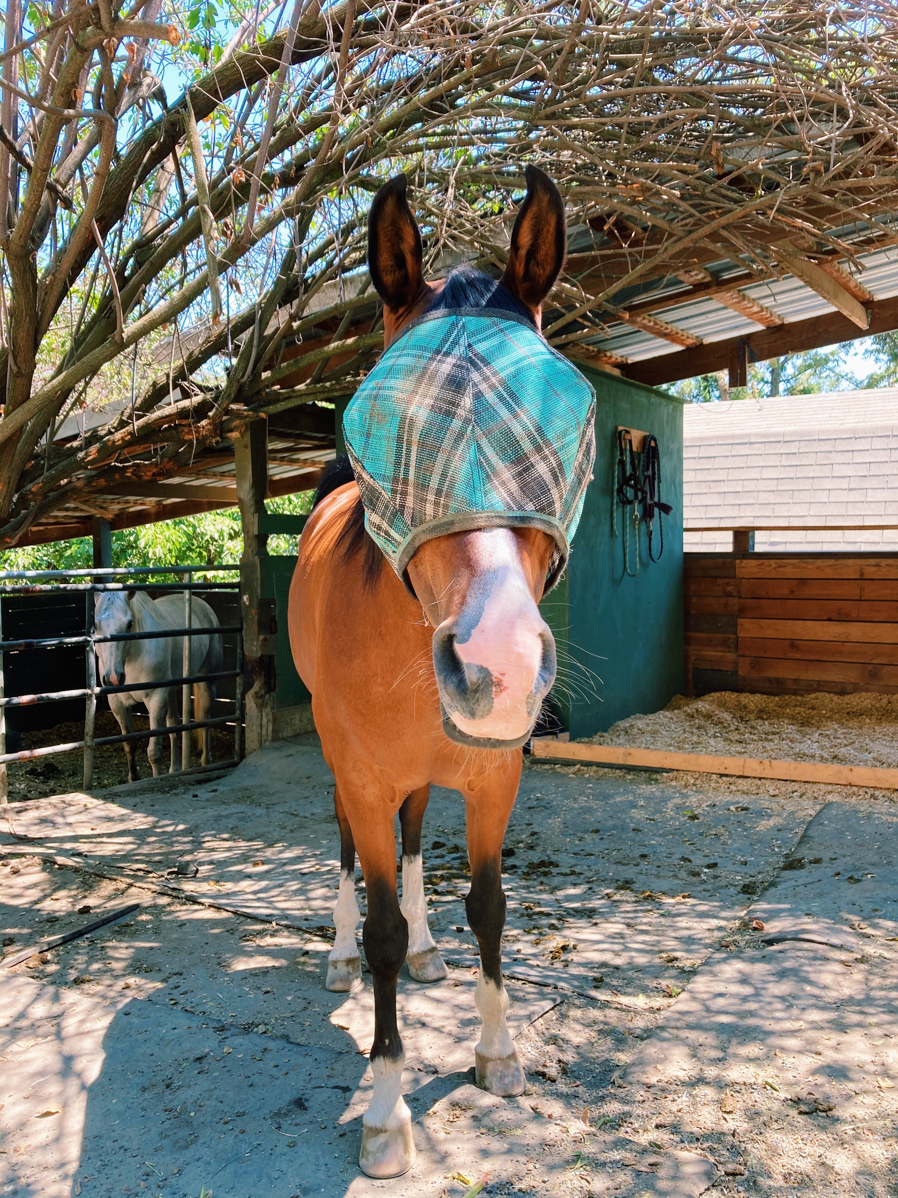 Capone has been chasing cans this summer, for the uninitiated that’s barrel racing. He’s even won money for it!! But then he decided to eat a random weed with his buddies and colic on and off for 2 days sending all that money to the equine veterinarian. He swelled up to warmblood size with hives, had to be tubed and was just overall unhappy. He bounced back really well to be a super lesson pony for Rey’s little sister Sena. We worked on basic horsemanship, steering and then some light obstacle riding. We started with waking up early, grabbing a bite and chatting/ singing in the car on the way there. She learned how to groom and in an orderly fashion that’s also effective, she learned about the various sprays I use on Capone, but I did them for her since Capone is spirited. We used Purvida Conditioning Spray, Eqyss Marigold Spray, Sport Horse Essentials (SHE) Waterless Shampoo & Stain Remover and our usual Bronco Citronella Fly spray that reminds me of summers with Grandma Jacobs. After we covered that we went through tacking up, saddle fit, various disciplines and more. We ultimately left him untacked because we were working on steering on the ground in a halter anyways. I opted for my Tory Leather halter, which they so kindly reposted back when we were at Webb.