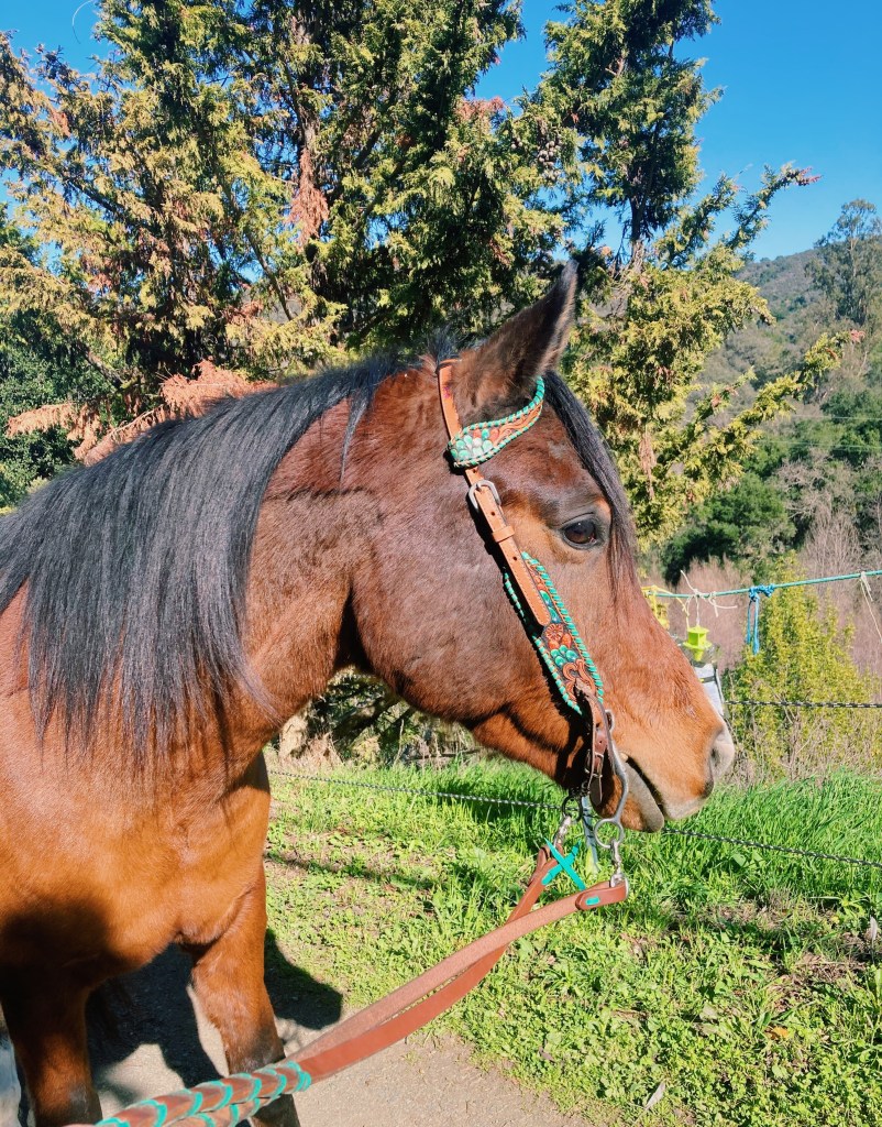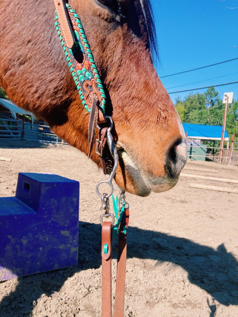 I tidied up his hooves outside and on the sole with my sturdy blue hoof pick. Technically, its not the very one that came with my SHE package (that one was black), but I exchanged it back at Webb to match my grooming kit so everything is blue. I treated his thrush in his right front with my SHE Hoof Oil (check out this post for more information on the oil itself) and treated him for being so good with some front leg stretches. We didn’t have the right saddle in the tack room, so I was just planning on hopping on bareback, but I was slightly worried about the quality of my ride without the stability a saddle provides for my first ride back. I would’ve used my bridle on Capone, but it’s still missing a couple components for actual work. Instead, I opted for his owners new and absolutely stunning one ear headstall with a cactus hand tooled onto it with matching reins and Capone’s new bit. That’s right, he grew up and takes a bit now.