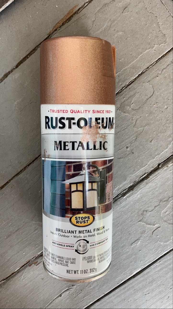 Forgive my dirty can, but I have this amazing Rustoleum rose gold metallic spray paint for another DIY I have been working on. I thought about the headstall and I wrapped the dark leather up in tape to protect it and then I laid out a card stock poster board on the balcony and I went to town on the gross silver hardware.