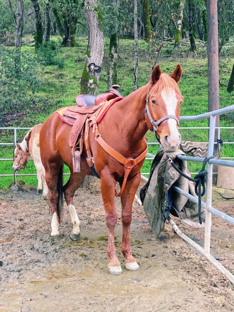 Sheās sunken into a hole under the mat so she looks very downhill here, but sheās really quite lovely looking. A fun fact for me is sheās related to another of our horses named Ollie (I will add a photo of him below so you can see the resemblance). Sheās apparently an Appendix, so sheās half Quarter horse and half Thoroughbred. She is slightly funky shaped in terms of saddle fit around the shoulders so I can kinda see it, but I canāt wait to fact check it with my boss. Pictured below as I promised is Ollie.