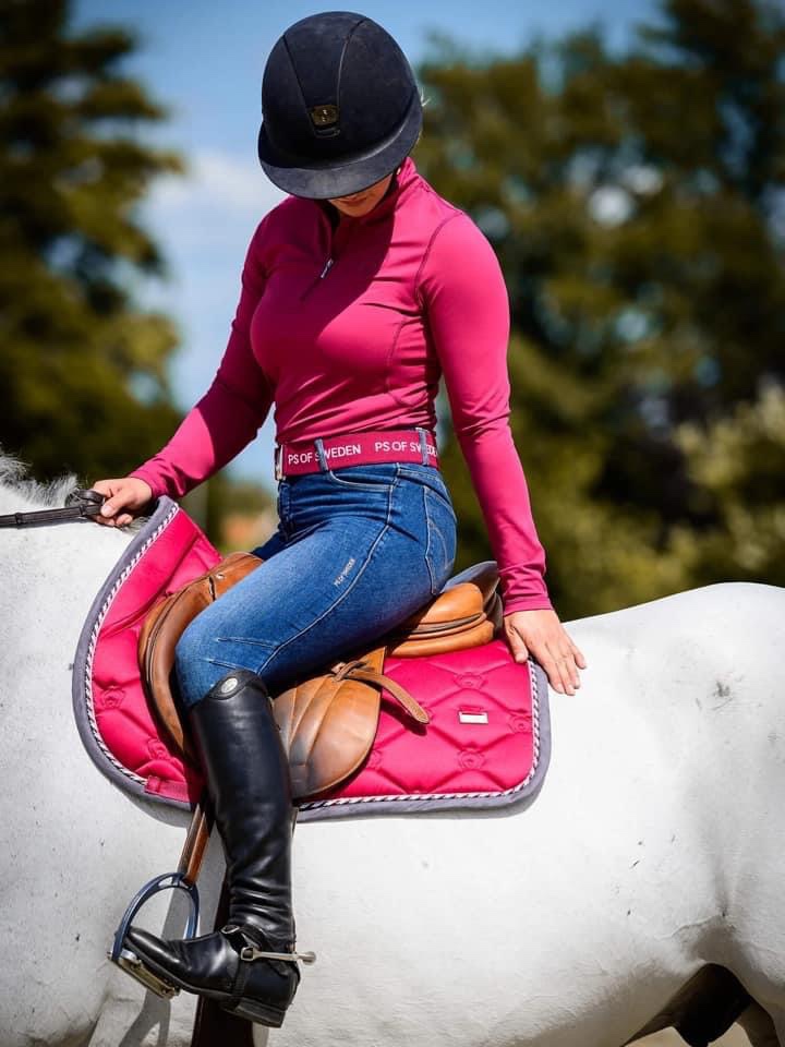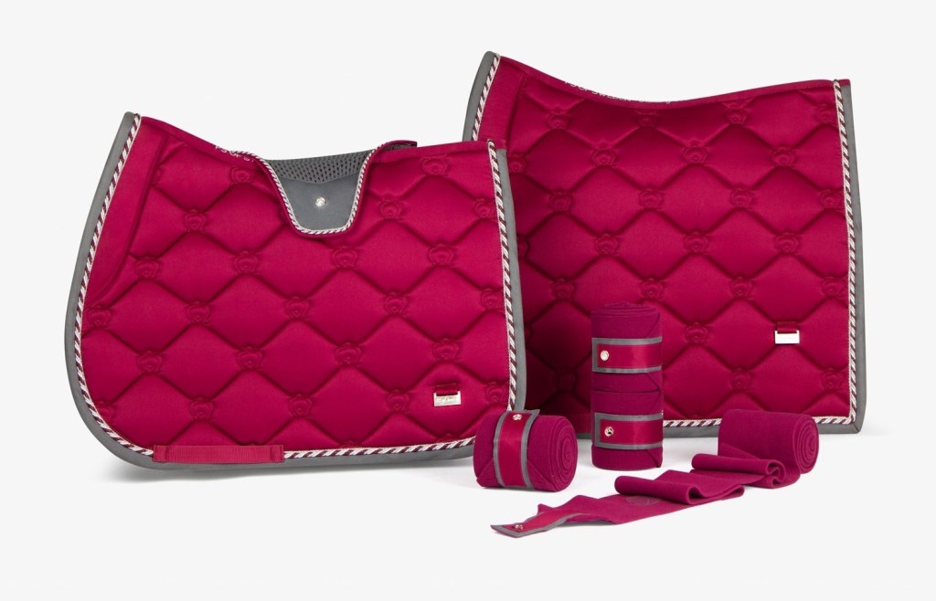Back in September of 2020, PS of Sweden released their Scarlet collection for the Fall Winter collection. It’s a vibrant red pink, scarlet, as the name suggests paired with a consistent grey called Anthracite, another collection from PS of Sweden. Pictured below is both jump and dressage cut pads with the bonnet and polos on display.