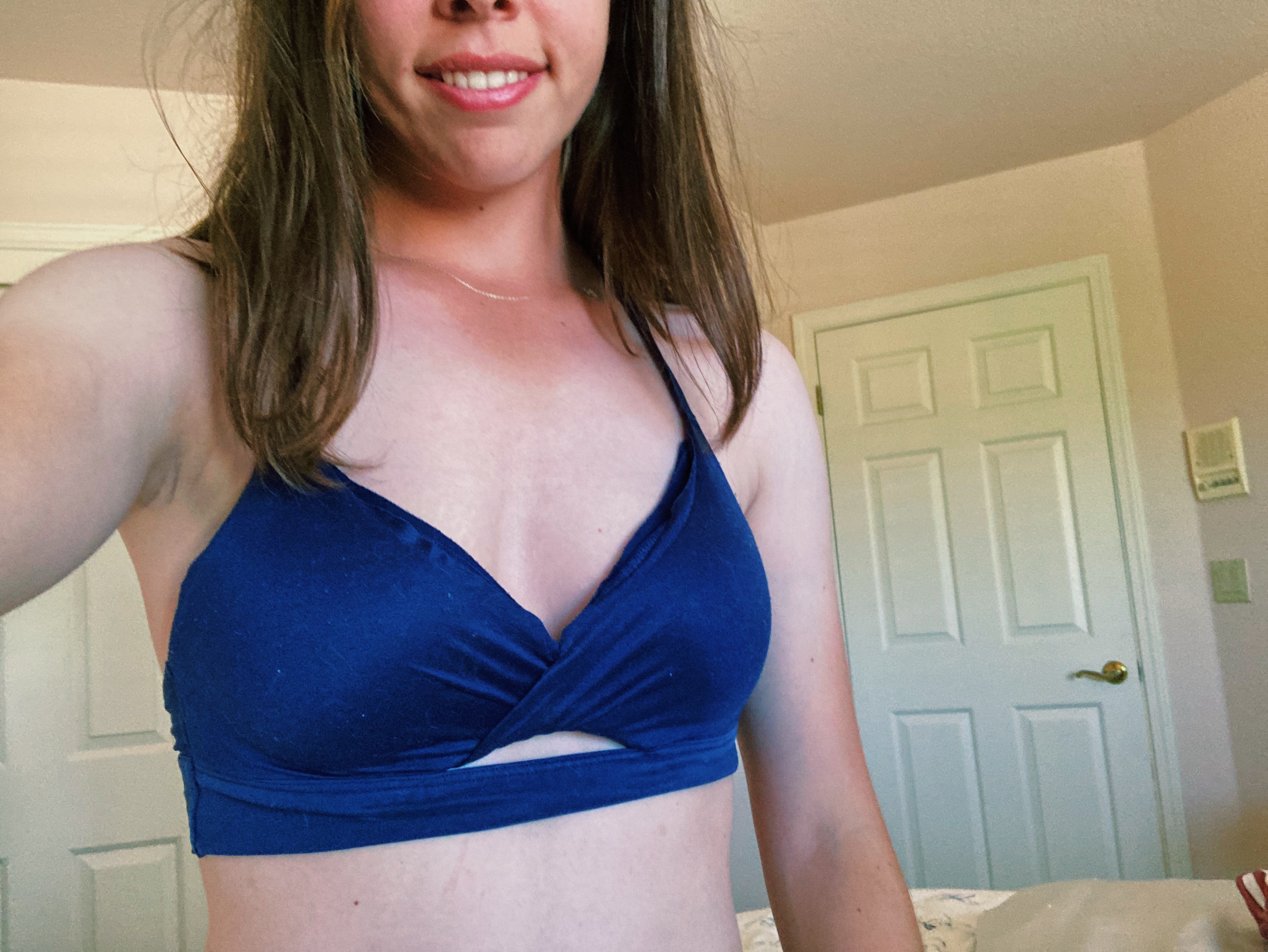 Priced at $45 usually, I grabbed mine for $16.99 in the sale bin. It’s a very sophisticated blue grey color they’ve called “Frosted Blueberry”, with support for days. I have a similar comfy bra at home that has been long used and abused and needed to be replaced. It’s the 2017 Easy Twist style bra by Victoria’s Secret in navy blue. I have photos of both styles below so you can see the old before we replace it with the new.