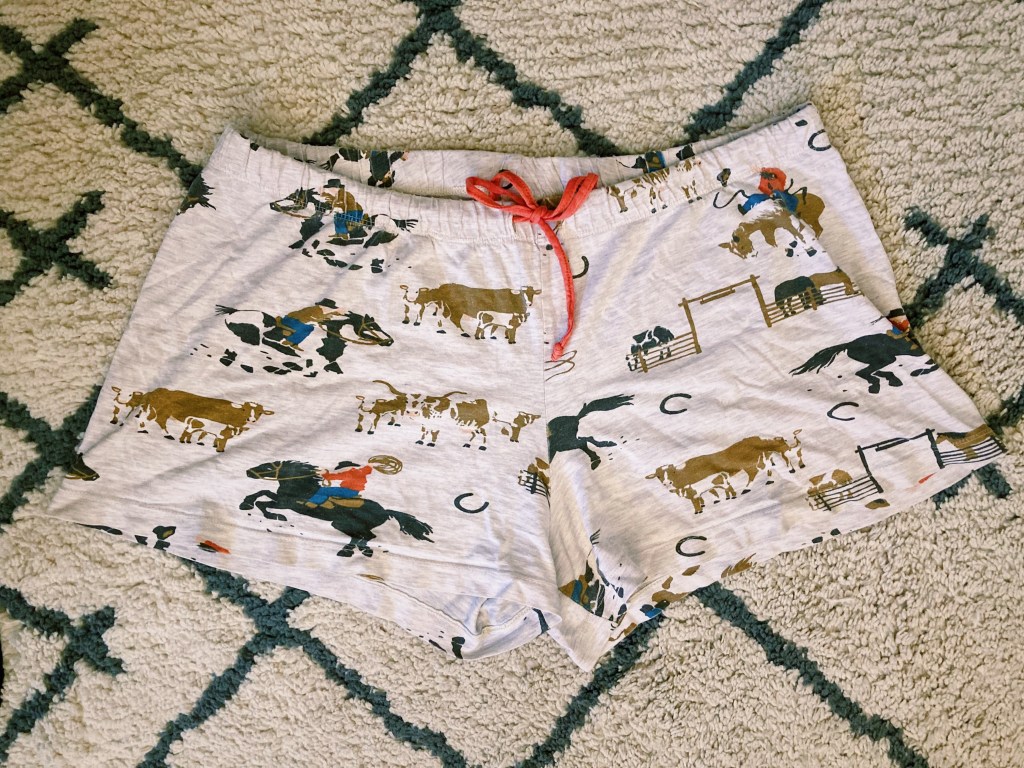 These shorts were everything I ever wanted in a pj set as an equestrian and western rider. They were under $5, and just a steal in my mind. They are a large so they sit low on my hips and luckily tie shut to accommodate my real size. They are a soft cotton, the pattern is printed on there with like super glue, so no amount of washing or drying has damaged the images.