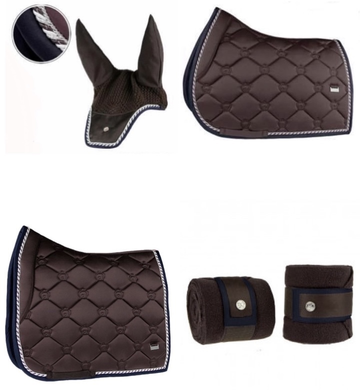 The collection was about the same size as the average capsule, with about seven pieces in it. I am the ultimate matchy matchy girl so I would love to collect all pieces of the collection as time goes on, but to start I need a pad and bonnet. I have always bought full size jump pads, and full size ear bonnets. My collection runs on the basics. However, I recently learned the art of polo wraps, so a set of four of those uncut, and a full size dressage pad are in order. Because I clearly have lofty dreams like owning this full set, I would imagine if I showed, I would need the matching browband in a size 3. The size 3 browband fits heads as big as a 17hh, and a small 14.2 pony.