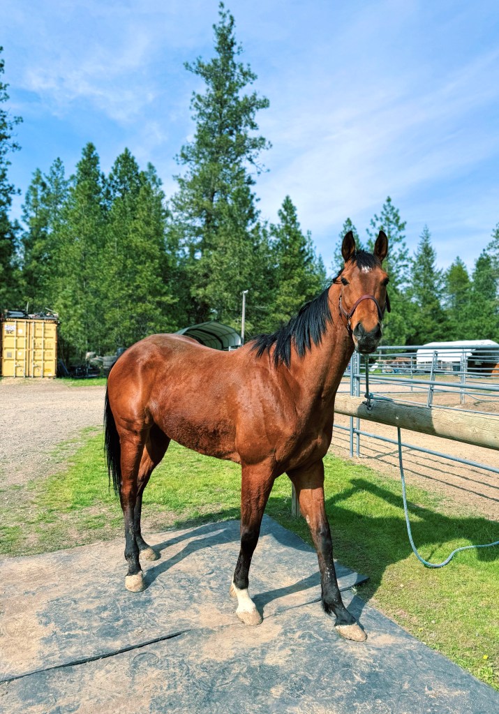 I had arranged a barn for him, talked over all the options for a stall or pasture spot for him, and agreed on a respectaable quarantine protocol. I had a medium weight Weatherbeeta blanket arriving there for him so he wouldn’t be cold when he arrived, and more. The weather at the time was snowy, icy and just cold. He got to his destination in about 3 days, and mostly settled in okay. The hauler provided many photos, updates and was easy to contact. For some time he pretty much refused to come inside the interior portion of the stall, and my barn owner warned me. After 2 weeks of settling in she also let me know he had started displaying a lack of confidence in the form of a MEAN left hind kick. I let her know I would be up in the Pacific Northwest in late April to help correct the behaviors.